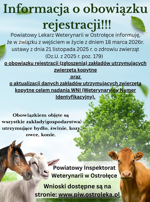 Powiatowy Lekarz Weterynarii w Ostrołęce informuję, że w związku z wejściem w życie z dniem 18 marca 2026r. ustawy z dnia 21 listopada 2025 r. o zdrowiu zwierząt (Dz.U. z 2025 r. poz. 179) o obowiązku rejestracji ( zgłoszenia) zakładów utrzymujących zwierzęta kopytne oraz o aktualizacji danych zakładów utrzymujących zwierzęta kopytne celem nadania WNI.